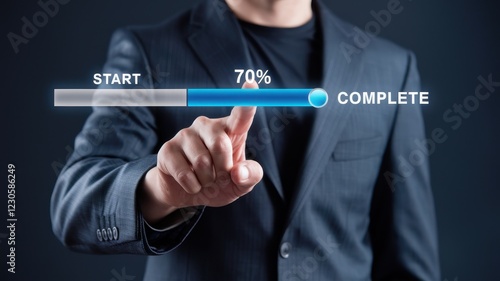 progress, bar, interface, businessman, complete, start, business, technology, digital, screen, hand, touch, finger, interaction, workflow, process, achievement, completion, success, goal, objective, target, project, management, planning, strategy, development, execution, result, performance, productivity, efficiency, innovation, future, growth, advancement, modern, professional, corporate, suit