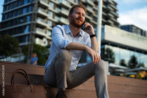 Businessman using the phone while sitting on the stairs. Happy man using the phone.