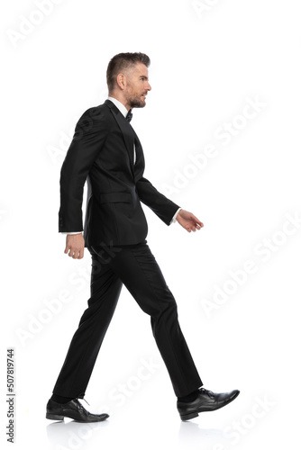 half face, side, walking, stepping, moving, full body, full-length, man, guy, businessman, model, groom, bridegroom, people, business, fashion, tuxedo, suit, tuxedo, bow tie, bow tie, young, photogenic, attractive, sexy, elegant, standing, looking, smiling, happy, white, isolated, black, background, mid-age