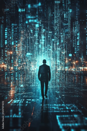 businessman, walking, digital, city landscape, night, technology, datum, abstraction, urban, neon, light, perspective, modern, silhouette, street, motion, future, design, concept, investment, corporate, innovation, virtual, environment, skyscraper, blue, glow, atmosphere, networking, information, speed, artificial, intelligence, background, journey, trend, success, connectivity, creative, marketing, solitude, exploration, imagination