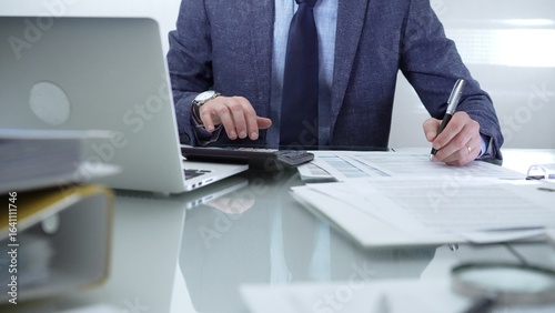 businessman, accountant, finance, office, laptop, computer, calculating machine, accounting, desk, work, working, job, business, document, paperwork, analysis, canvasses, analysing, strategy, planning, corporate, professional, occupation, men at work, management, executive, technology, datum, report, investment, money, man, male, suit, blue, at work, sitting, people, inspecting, tax, communication, glasses, table, unknown, discussing, closeup, hand, magnifying glass, pen, video