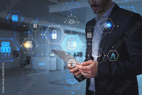 businessman, business, cooperation, tablet, screen, virtual, globe, digital, interface, communication, network, conversation, icon, padlock, security, coin, money, deal, agreements, hand, hold, graph, line, promotion, meeting, office, workplace, workspace, background, man, suit, formal, leadership, future, career, employee, account, imagination, success, goal, intellect, contraption, device, development, message, cloud, datum, storage