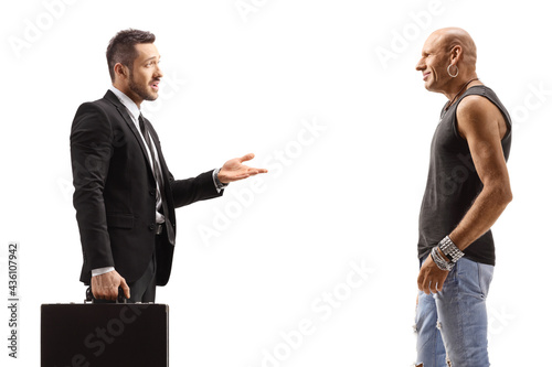 2, adult, background, bald, bracelet, briefcase, businessman, casual attire, caucasian, cheerful, conversation, discussing, diversity, explaining, expression, guy, happy, hipster, isolated, jean, lifestyle, listening, male, man, middle-aged, people, person, profile, punk, punk rock, rock, rocker, salesman, smile, smiling, standing, studio, style, suit, talking, white, young