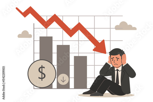 business, stress, graph, businessman, financial, crisis, concept, market, arrow, down, money, decrease, loss, investment, bankruptcy, flat, vector, illustration