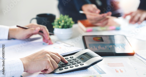 Businessman working at office with documents, calculating and analyzing the financial report, business plan investment, finance analysis concept. Using calculator.