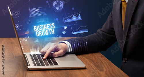 Businessman working on laptop with BUSINESS GROWTH inscription, new business concept