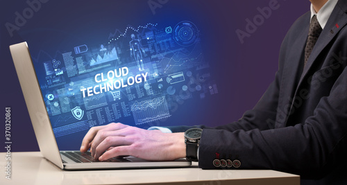 Businessman working on laptop with CLOUD TECHNOLOGY inscription, cyber technology concept