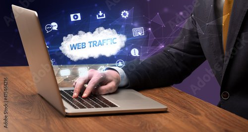 Businessman working on laptop with WEB TRAFFIC inscription, modern technology concept