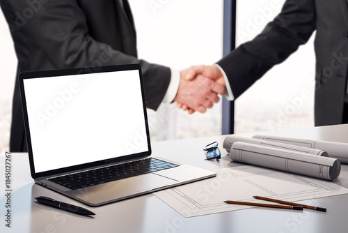 Businessmen handshake behind laptop with blank screen on desk, office workspace with blueprints and glasses, clean corporate background.
