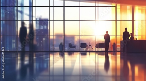 Businesspeople Silhouetted Against Sunset Cityscape Viewed Through Large Office Windows