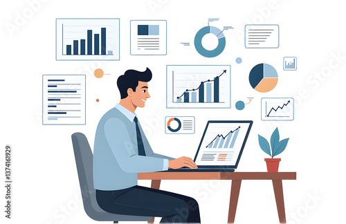 Businessperson Uses A Laptop To Analyze Financial Data, Surrounded By Numerous Charts And Graphs On The Screen Dis