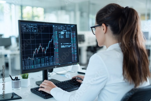 Businesswoman analyzes stock market data on a computer screen in a modern office setting, focused on financial growth and investment trends.