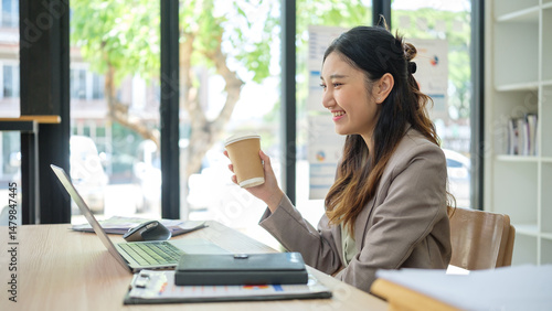Businesswoman enjoying coffee while working on her laptop in a modern bright office.