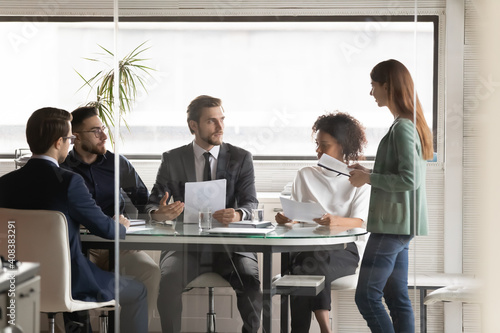 Businesswoman presenting financial project statistics to diverse colleagues at corporate briefing, standing in boardroom, discussing strategy with executive, business partners group negotiation