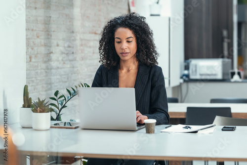 businesswoman, using, laptop, desk, office, copy space, technology, 1, people, computer, communication, adult, online, business, woman, african american, ethnicity, black, casual attire, occupation, job, cyberspace, connection, wireless, sitting, working, startup, modern, creative, professional, mid, table, curly hair, female, african, american