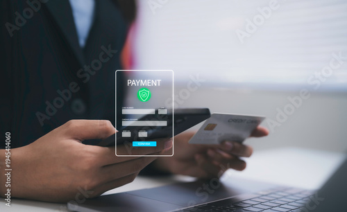 Businesswoman using smartphone and credit card completing secure online payment with digital payment interface. Concept of ecommerce transaction mobile banking fintech security and cashless technology
