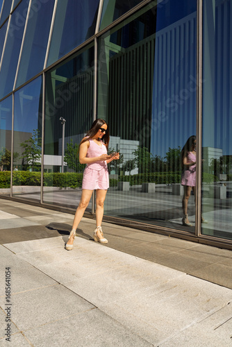 businesswoman, smartphone, business building, modern architecture, communication, technology, business, city, urban, professional, work, mobile, device, connectivity, cyberspace, online, wireless, summer, fashion, style, elegant, confident, successful, female, executive, career, entrepreneur, lifestyle, outdoors, daytime, sunlight, full-length, standing, walking, street, sidewalk, city landscape, corporate, district, finance, real estate, skyscraper, window, contemporary, design, geometric, abstract