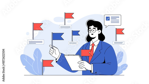Businesswoman with Flags and Clipboard, Goal Setting, Strategy Planning