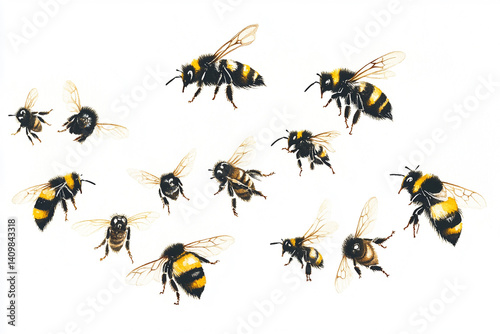 bee, bumblebee, insect, watercolor, painting, flying, swarm, nature, wildlife, art, yellow, black, brown, wing, transparent, delicate, detailed, animal, buzzing, pollinator, white, background, illustration, fauna, honey, bee, in, flight, insect