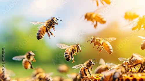 Busy bees pollinating flowers in a vibrant garden during sunlight.