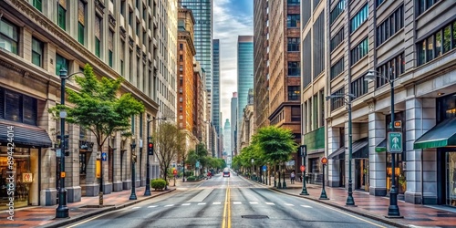 Busy urban street scene with rows of tall buildings and empty sidewalks where people would normally walk, conveying a sense of isolation and caution.