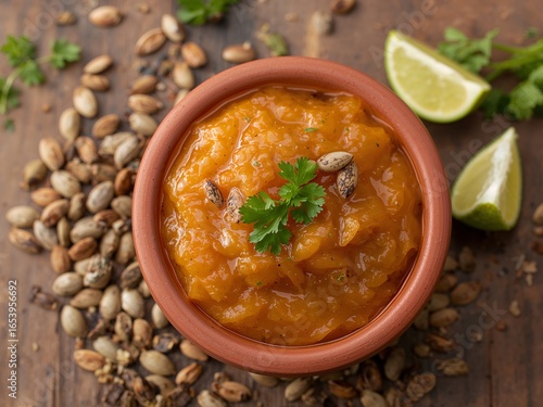 Butternut Squash Soup in Clay Bowl, Garnished with Seeds and Cilantro, Lime Wedges.