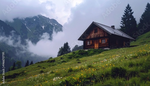 Cabaña de madera aislada en una colina verde entre montañas brumosas