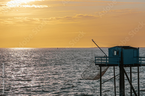 sunset, hovel, evening, heaven, orange, tour tourism, landscape, forest, france, sea, ocean, fishing net, net, atlantic, summer, sunny, dock, shore, touristy