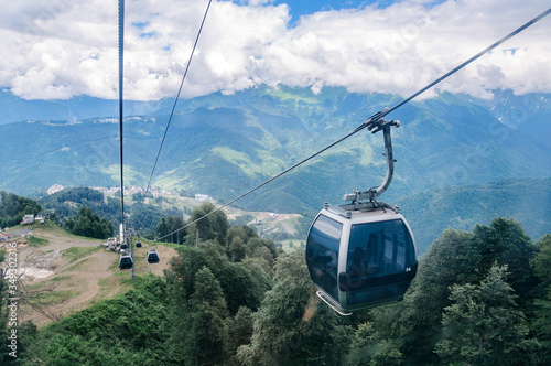 Cabins of the cableway above the tops of trees against the backdrop of mountains and clouds.