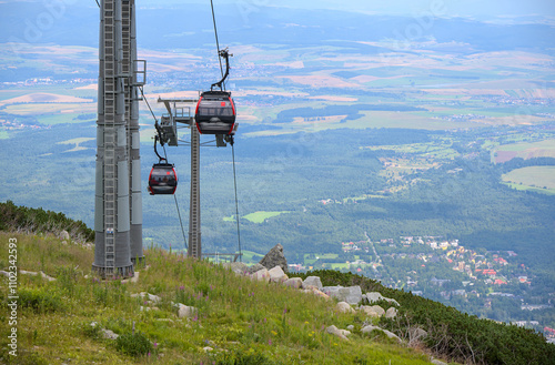 Cable cars ascending above rocky terrain with a panoramic view of forests, farmland, and distant villages.