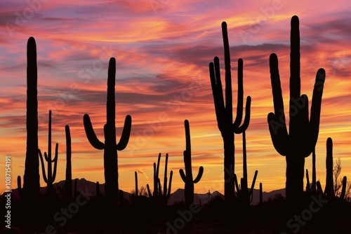 Cactus Silhouette Stands Majestically Against Vivid Sunset Sky in Desert Landscape