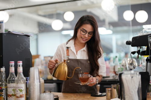 Cafe or coffee shop barista, entrepreneur and female small business owner of successful modern