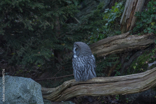 Caged Great grey owl in a park in Stockholm