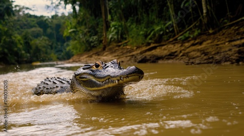 Caiman emerging from muddy water in lush rainforest habitat displaying natural wildlife behavior and environment