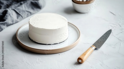 cake plate with a piping practice tool and knife set on a clean surface, captured in 4K, showcasing the artistry of cake decorating with sharp precision