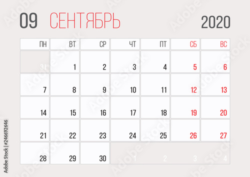 2020, russian, business, calendar, colours, date, day, design, diary, event, graphic, grid, illustration, month, monthly, new, number, office, organiser, planner, red, schedule, season, set, simple, sunday, template, time, vector, wall, week, white, year, september, premium, print