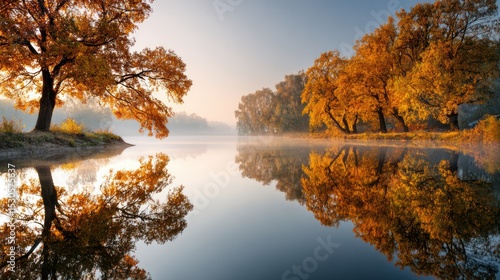 Calm autumn lake with perfect reflection of golden maple trees, mirror-like water surface, soft morning mist above the lake, peaceful and symmetrical composition