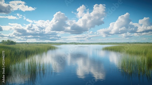 Calm river, lush reeds, blue sky, clouds reflect, tranquil nature scene