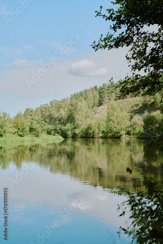 Calm river reflecting green trees and blue sky with scattered clouds, forested hillside rising in background, leafy branches framing scene, tranquil natural landscape, no people visible