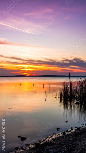 sunset, lake, water, sky, cloud, calm, nature, gold, horizon, peaceful, tranquil, colourful, vibrant, orange, purple, twilight, evening, beautiful, scenic, landscape, outdoors, serene, dramatic, colours