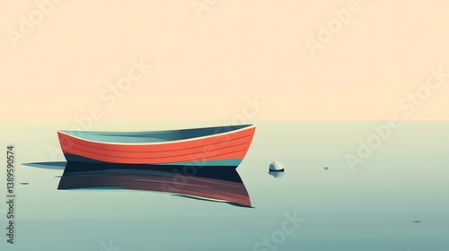 Calm sunset, red rowboat floats on tranquil water, reflecting.