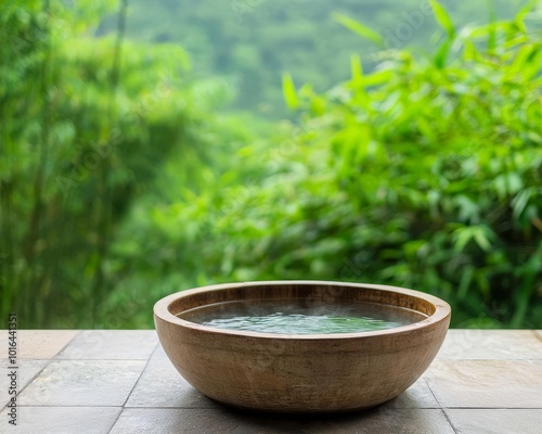 Calm water bowl on a table, surrounded by lush greenery in a peaceful setting.