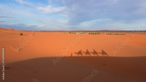 Camel shadow in desert. Trip to Sahara desert in Morocco. Beautiful african travel photo. Sandy landscapes, dunes, and nature. Summer vacation in arab country.