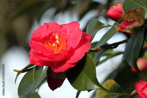 Camellia flowering bush with light and vivid pink blooms and dark green leaves