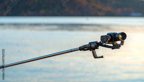 camera, pole, water, nature, outdoors, sunrise, sunset, still, black, metal, lake, morning, evening, video, closeup, photo, equipment, technology, landscape
