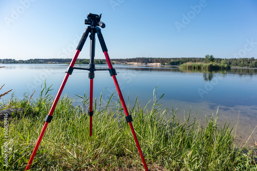 Camera red tripod standing in green grass near lake water natural landscape on clear sunny bright day