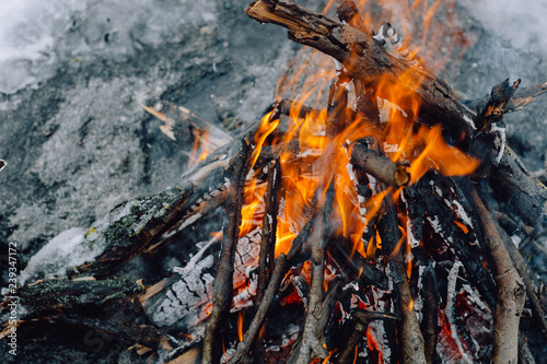 Camp fire in the snow . Concept adventure active vacations outdoor. Winter camping