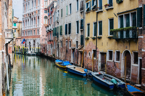 Canal between old houses with blue boats in the city Venice. Italy.