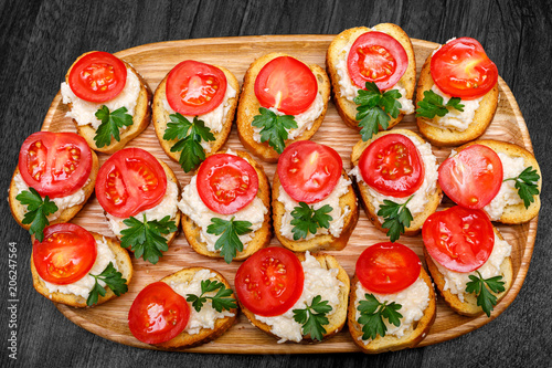 cheese, tomatoes, canape, toast, food, bread, epicure, healthy, fresh, delicious, cookery, green, meal, party, snack, breakfast, tasty, vegetable, sandwich, vegetarian, white, nourishment, dish, cooking, dinner, toasted, slice, background, isolated, cream, buffet, pepper, garlic, olive oil, grilled, baguette, chopped, diet, traditional, wooden, tray