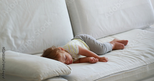 Candid baby sleeping on sofa in the afternoon nap. Cute infant toddler asleep
